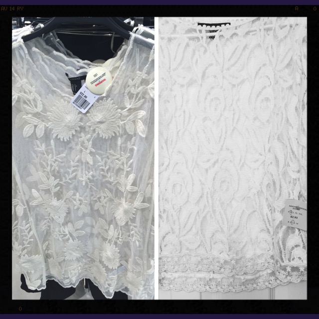 (Left: Forever 21 lace top $22.80 Right: Thrifted Top $2.93 Neighborhood Thrift Store)