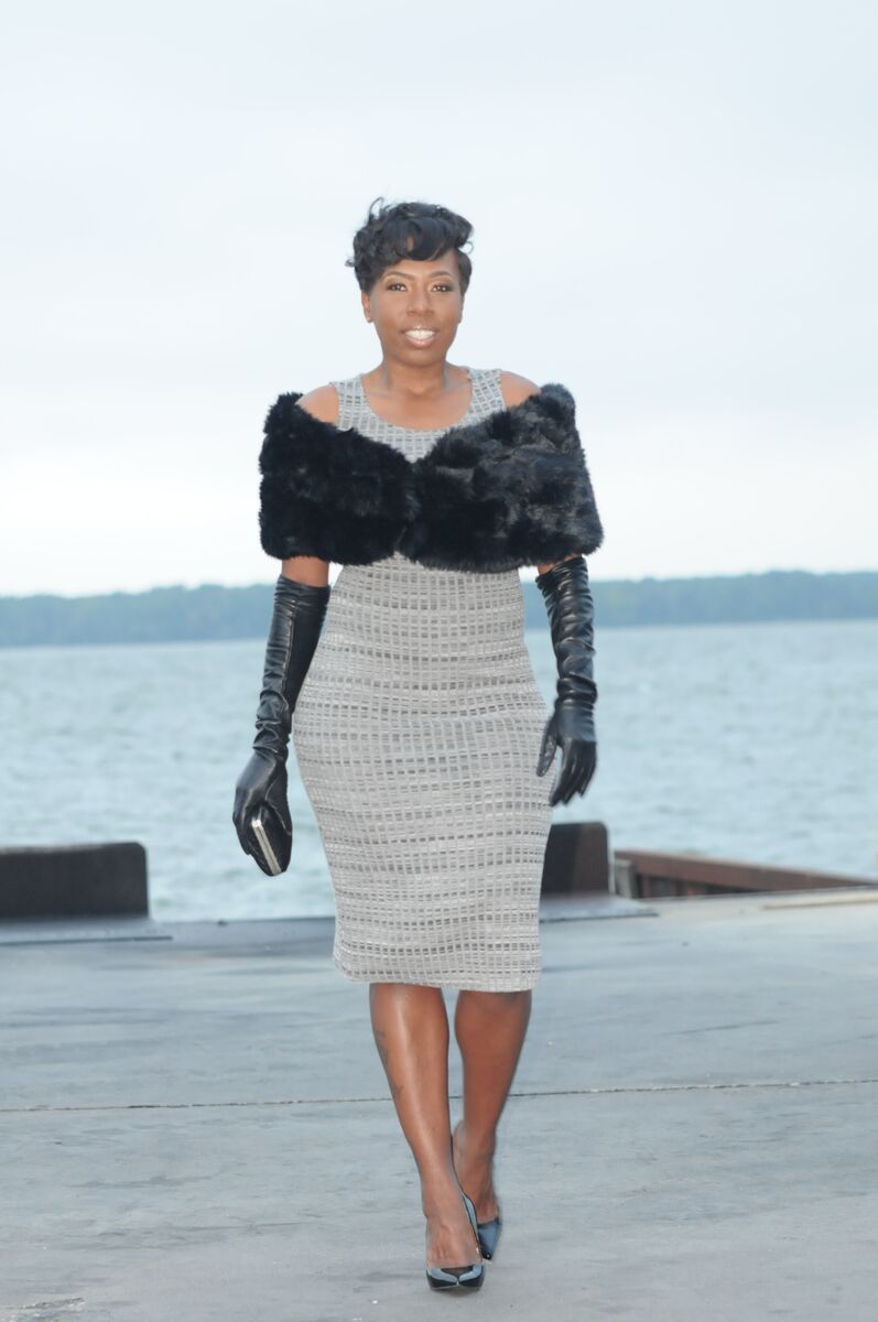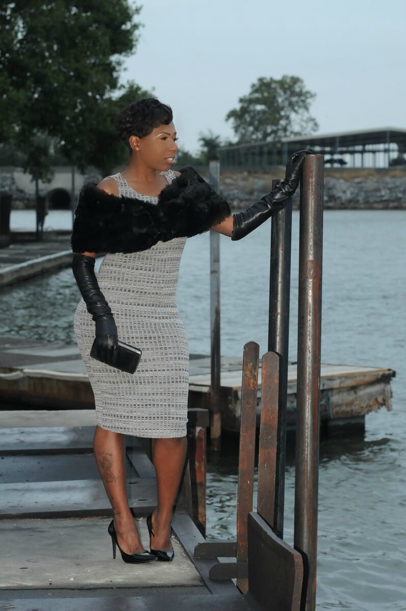 When I thrifted this dress, it fit my usual criteria: affordable, hug the hips and stops just above my calves. While, I know this criteria enhances my hourglass figure I challenged myself to add just a touch of a class. I knew I wanted to cover up the cut-out shoulders (I didn’t like them) and keep the look real simple. If you read my previous post a little faux fur will instantly upgrade any outfit and I was in search of some!
